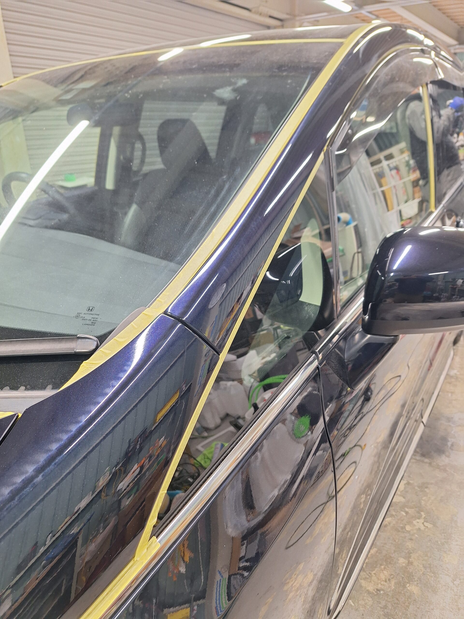 • ポリッシャー(研磨機)で磨く箇所の周辺(窓ガラス、ゴムパッキン、メッキパーツなど)を、細部にわたり黄色のマスキングテープで丁寧に保護していきます。