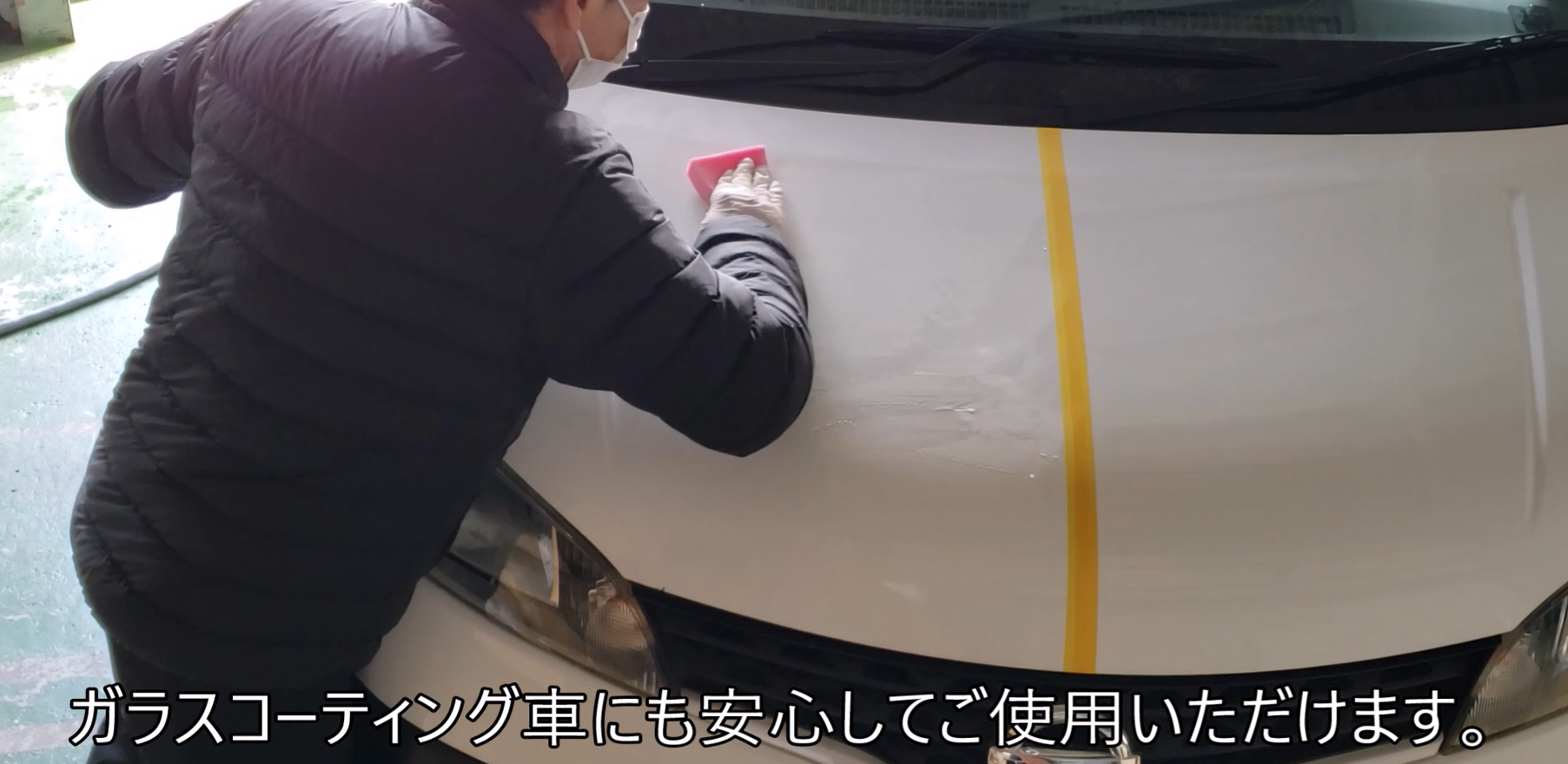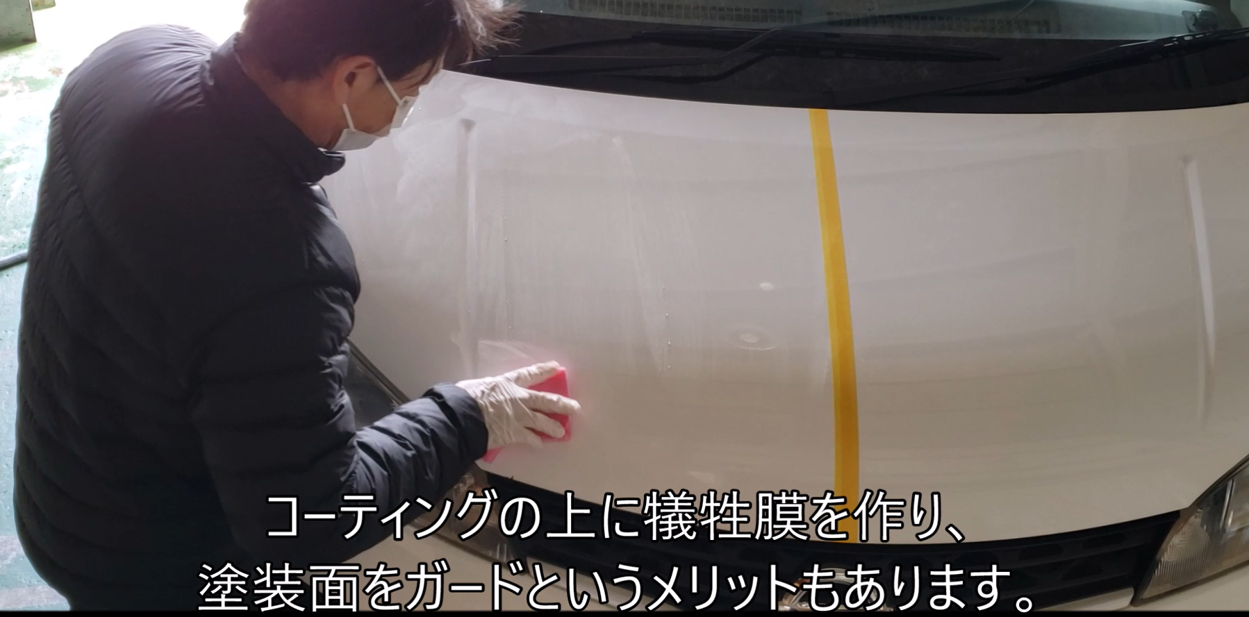 この工程で、コーティングの上に一層の「犠牲膜(汚れや傷を代わりに受けてくれる膜)」を作り、大切な塗装面をガードします。これがW被膜の1層目となります。