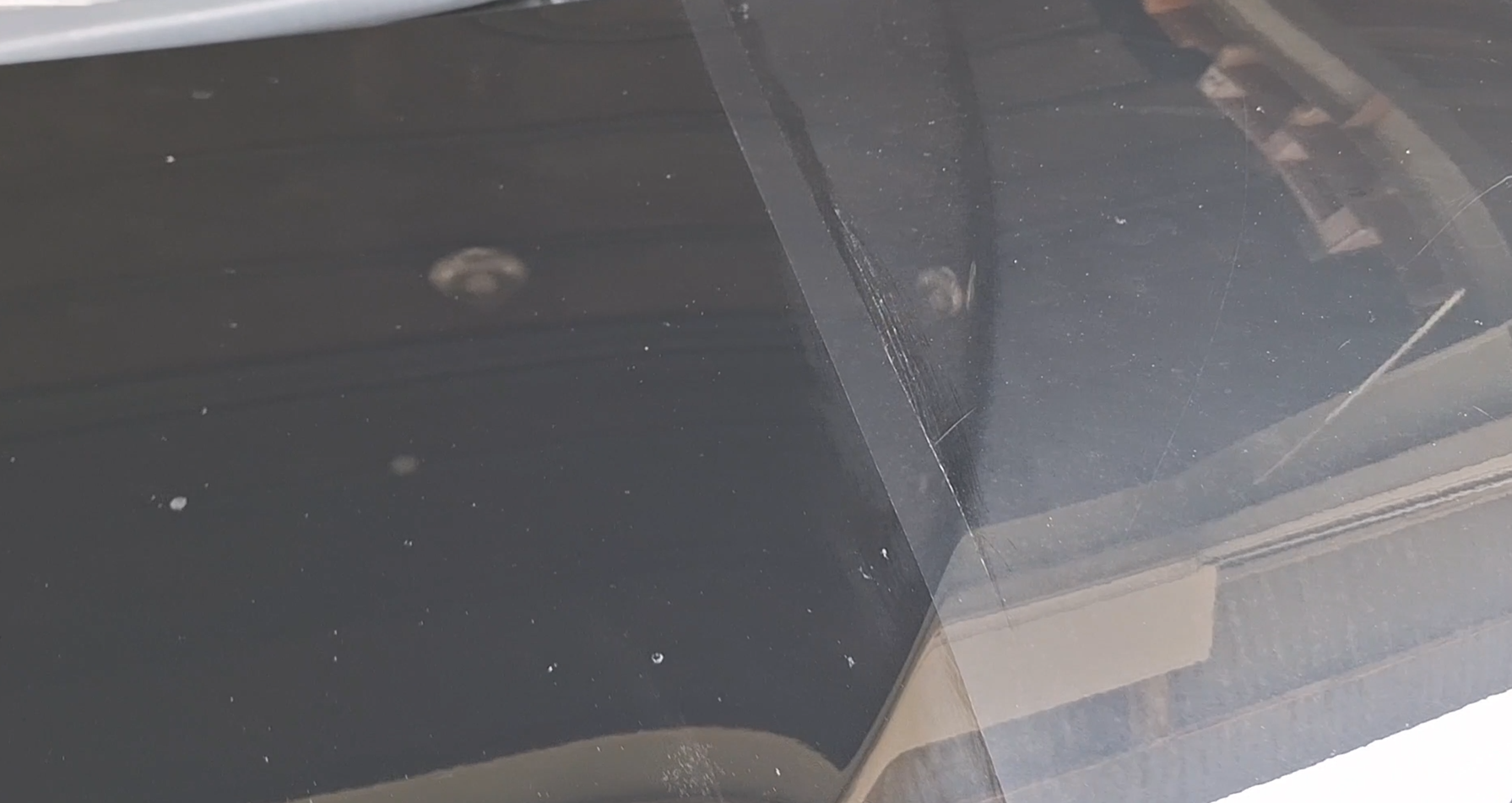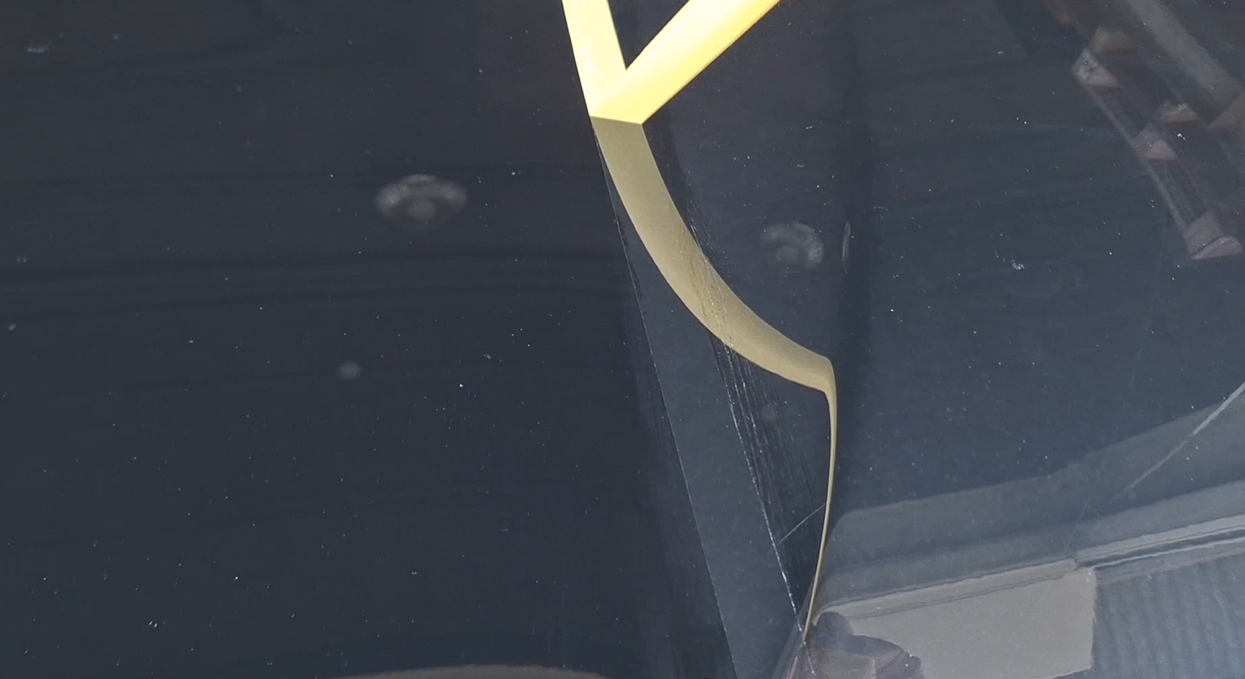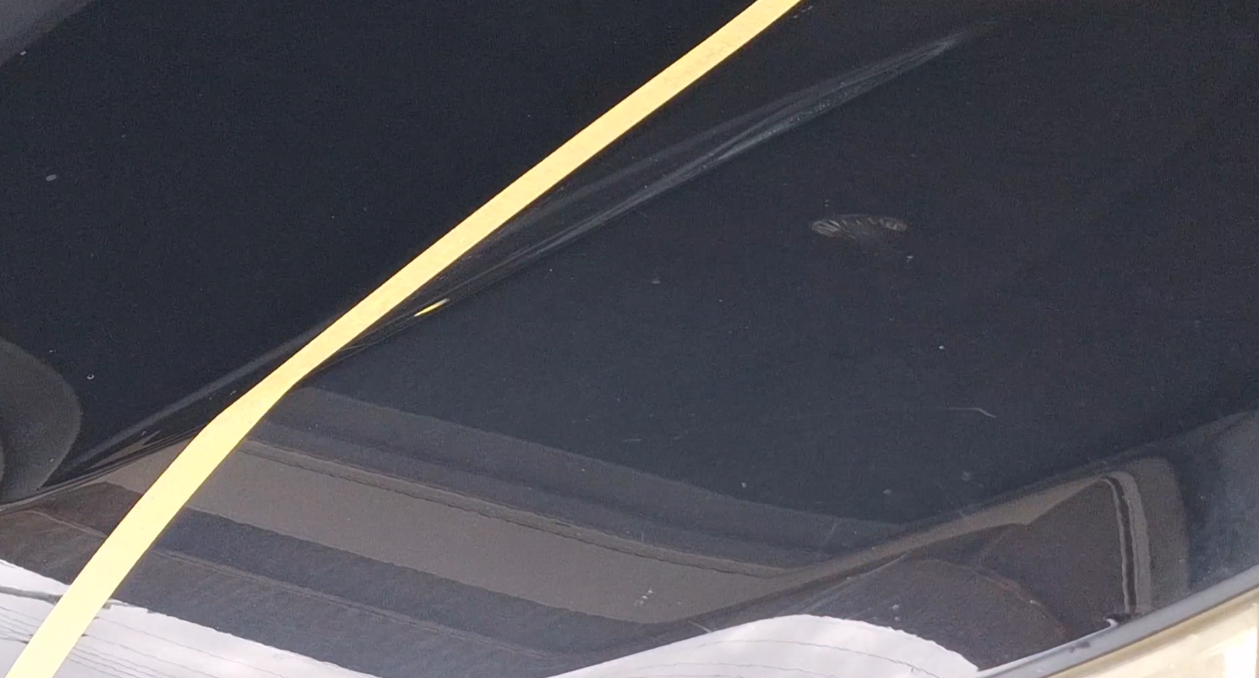 見てください、この圧倒的な差を! 左側の未施工部分はくすんで景色がボヤけていますが、右側の施工後は漆黒の深みが戻り、周囲の景色が鏡のようにハッキリと映り込んでいます。