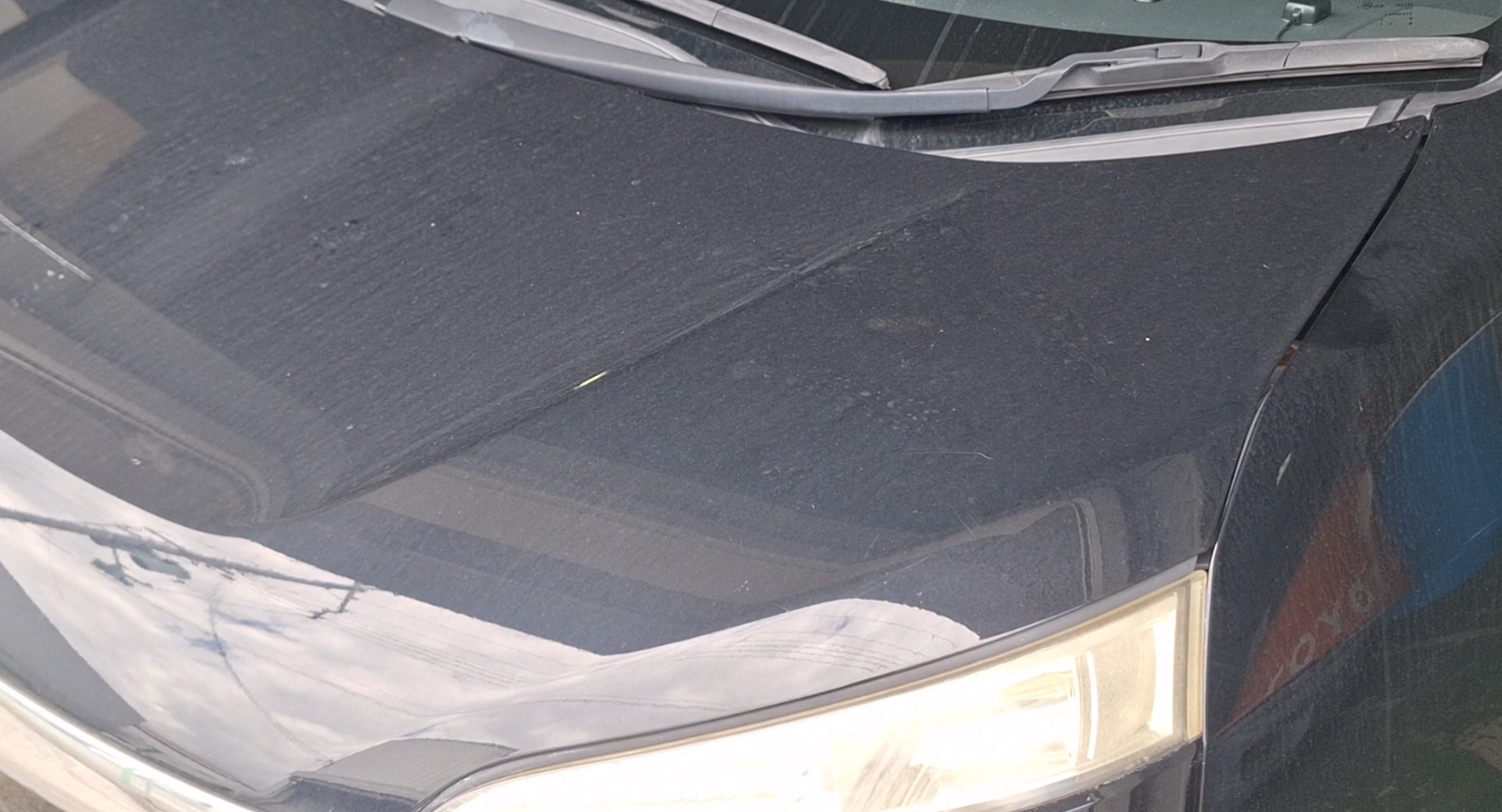 まずは施工前のボンネットです。 長年の雨染み(水垢)や、洗車傷などの小傷が原因で、本来の黒さが失われ、全体的に白っぽくくすんでしまっています。